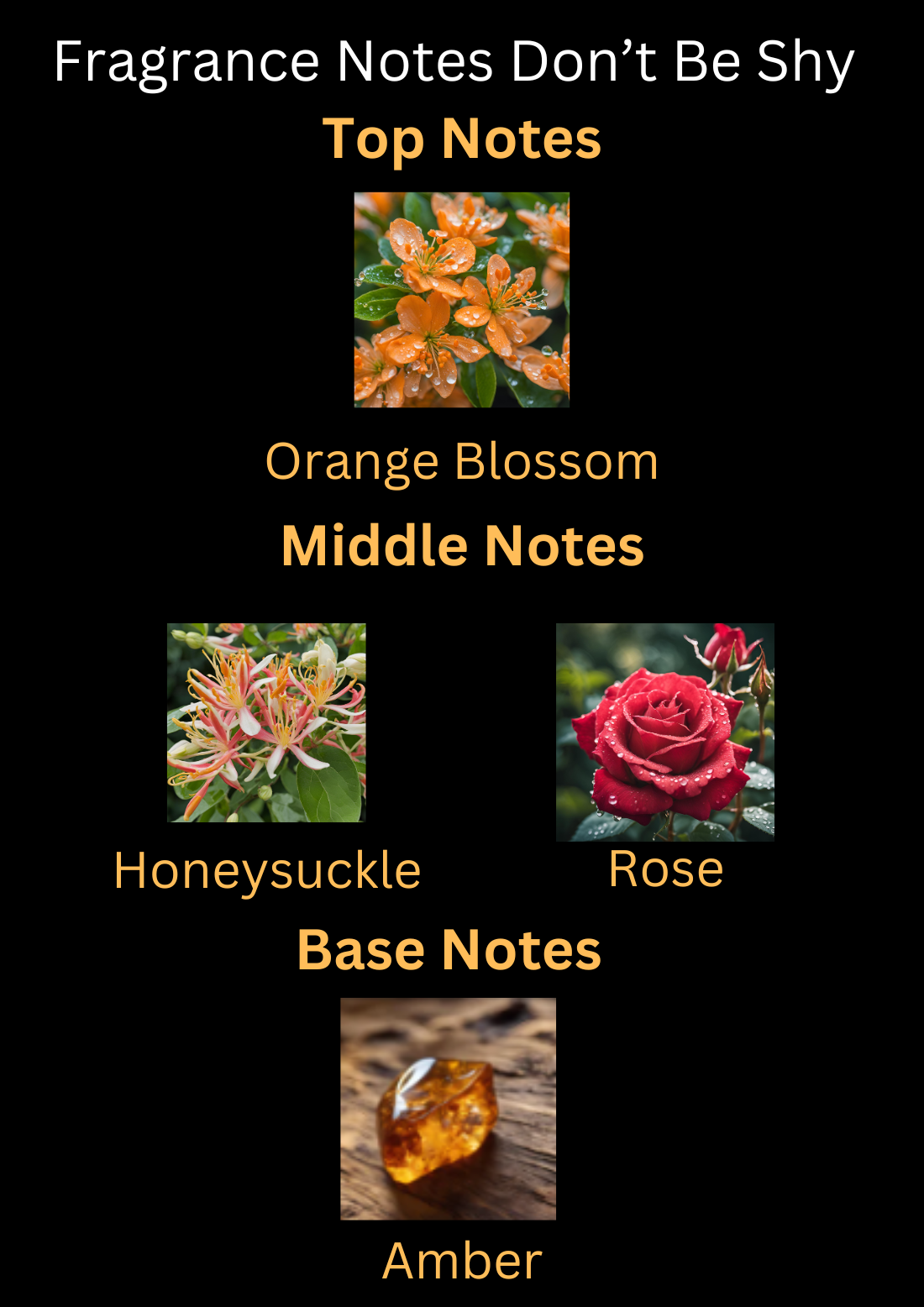 Don’t Be Shy Oil is a fragrance that evokes a sense of warm elegance and captivating charm. This indulgent scent combines delicate florals with a sensual amber base, creating a beautifully balanced aroma that lingers softly yet makes a lasting impression. Perfect for those who embrace sophistication with a touch of sweetness.