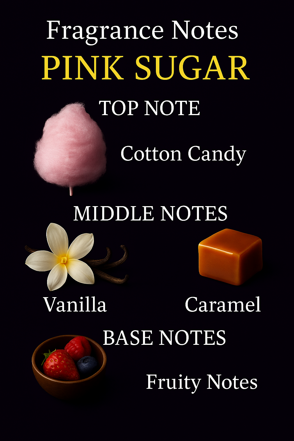 Pink Sugar is a playful yet luxurious fragrance that captures the sweetness of youth with a grown-up twist. Opening with the airy lightness of cotton candy, it melts into creamy vanilla and golden caramel, grounded by a soft touch of fruity nuance. Deliciously nostalgic yet surprisingly refined, Pink Sugar is a scent that delights the senses and lingers with irresistible charm.