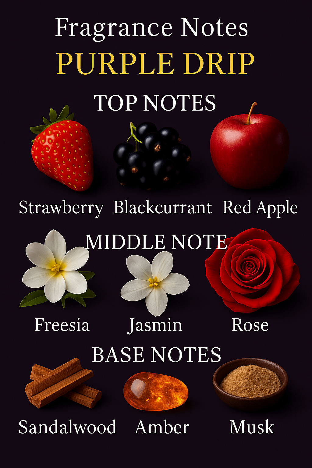 Purple Drip is a vibrant and seductive composition that opens with the juicy brightness of strawberry, rich blackcurrant, and crisp red apple. This mouthwatering trio gives way to a graceful bouquet of freesia, jasmine, and velvety rose, weaving a heart of delicate floral elegance. Anchored by the creamy warmth of sandalwood, golden amber, and soft musk, Purple Drip lingers with a smooth, enveloping finish that feels both youthful and refined. Lush, modern, and unforgettable — this is confidence in a bottle.